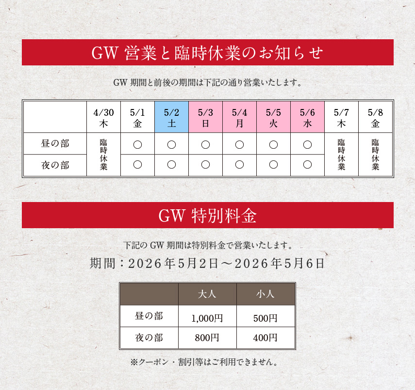 | 夜の部 | ○ | ○ | × | × | ○ | ○ | ○ |